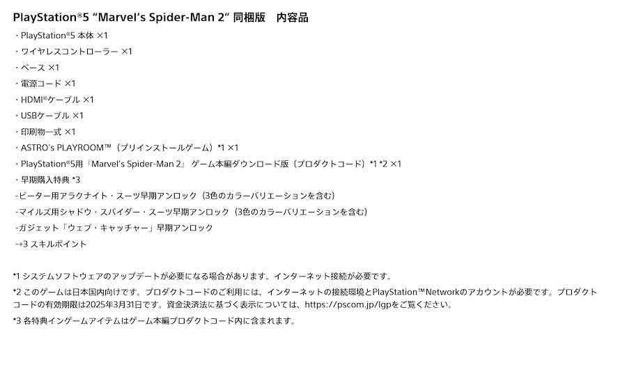通常1-5営業日で発送≪新品・未開封品≫:PlayStation 5本体 と、PlayStation 5用ソフトウェア『Marvel's Spider-Man 2』ゲーム本編ダウンロード版(プロダクトコード)をセットにした商品です。