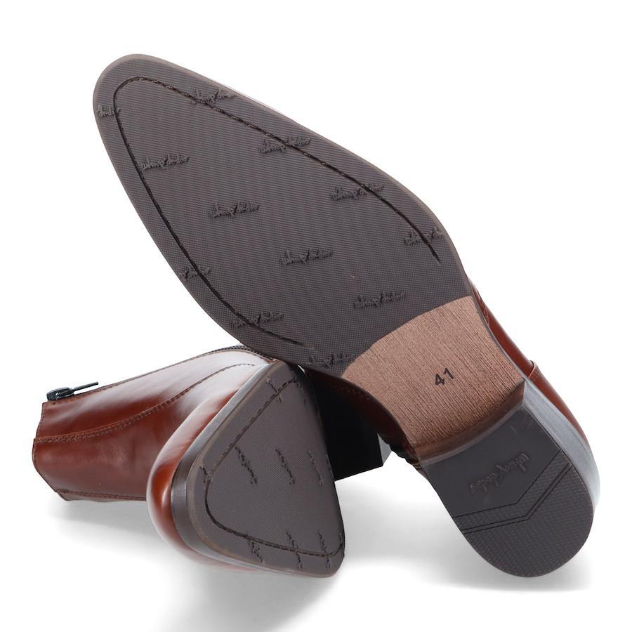 | ヒールアップポインテッドブーツ 【素材】 丁寧にオイルを馴染ませた牛革を使用。 革の繊細なキメがほのかに浮かび上がる上品な質感と、履き始めから足に馴染む柔らかさが魅力です。 【デザイン】 シャープな印象を足元に与えてくれるポインテッドトゥ。 細身なノーズとマッチした4.5cmヒールがエレガントな雰囲気をプラスしてくれます。 細身の足首回り縦に縫われたアッパーパーツでスリムなラインを更に強調。 スッキリとしたデザインを邪魔しない内ジップ仕様で、脱着も容易に出来ます。 スキニー系パンツやライダースと一緒にロックテイストなコーデや、セットアップスタイルに合わせてエレガントなモードスタイルに仕上げたりと、ファッション性の高い一足です。 ※天然皮革を使用しているため1足ごと、また左右で革の状態(キズやシワなど)が異なります。予めご了承ください。 【サイズ感】 革靴で25.5cm、スニーカーで26.5-27cmを着用するスタッフで<41/25.5cm>でジャストサイズでした。 ※サイズ感は、個人差がございますのであくまで参考程度にお考え下さい。 ■ブランド...whoop'-de-doo' costume no age ■カラー...BLACK,BROWN ■アッパー素材....牛革 ■底材.....合成ラバー ■ヒール...約4.5cm ■重さ(片足)...約505g ■中国製 *上記は全て25.5cmで計測した数値です。 *多少の誤差が生じる場合がございますので予めご了承下さい。 whoop de doo co.,ltd whoop'-de-doo' フープディドゥ |