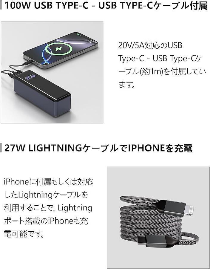 「セット内容」モバイルバッテリー本体、27W ケーブル、100W USB Type-Cケーブル、日本語取扱説明書。