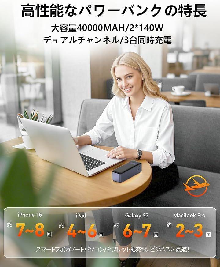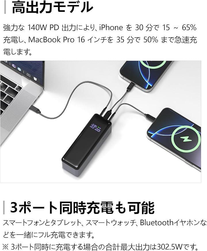 「デュアルチャンネル、PD3.1単ポート140W高出力、最大合計302.5W」Type-cポート(USB Power Delivery 3.1)が2つ備えて、最大140Wの超高出力でスマホやタブレットはもちろん急速充電できますが、ノートパソコン用モバイルバッテリーとして、MacBook Pro16インチのような高性能ノートPCも僅か30分で50%充電できます。機内持ち込みが可能で、旅行や出張に最適です。