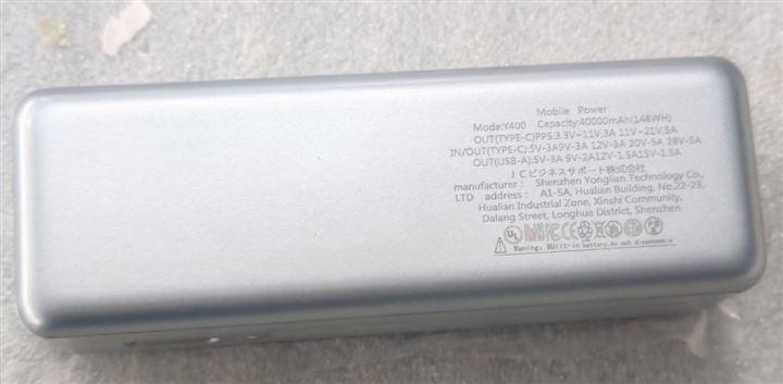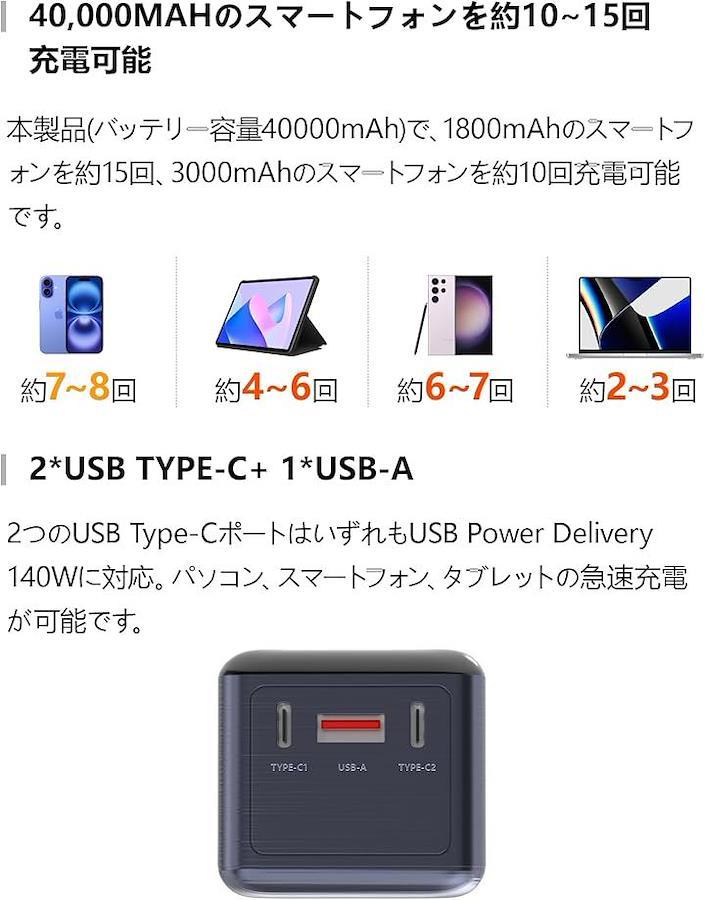 「詐欺なしの大容量 40000mAh (148Wh) 」容量詐欺が常態化しているモバイルバッテリーには珍しく、正直に容量を表示しています。
