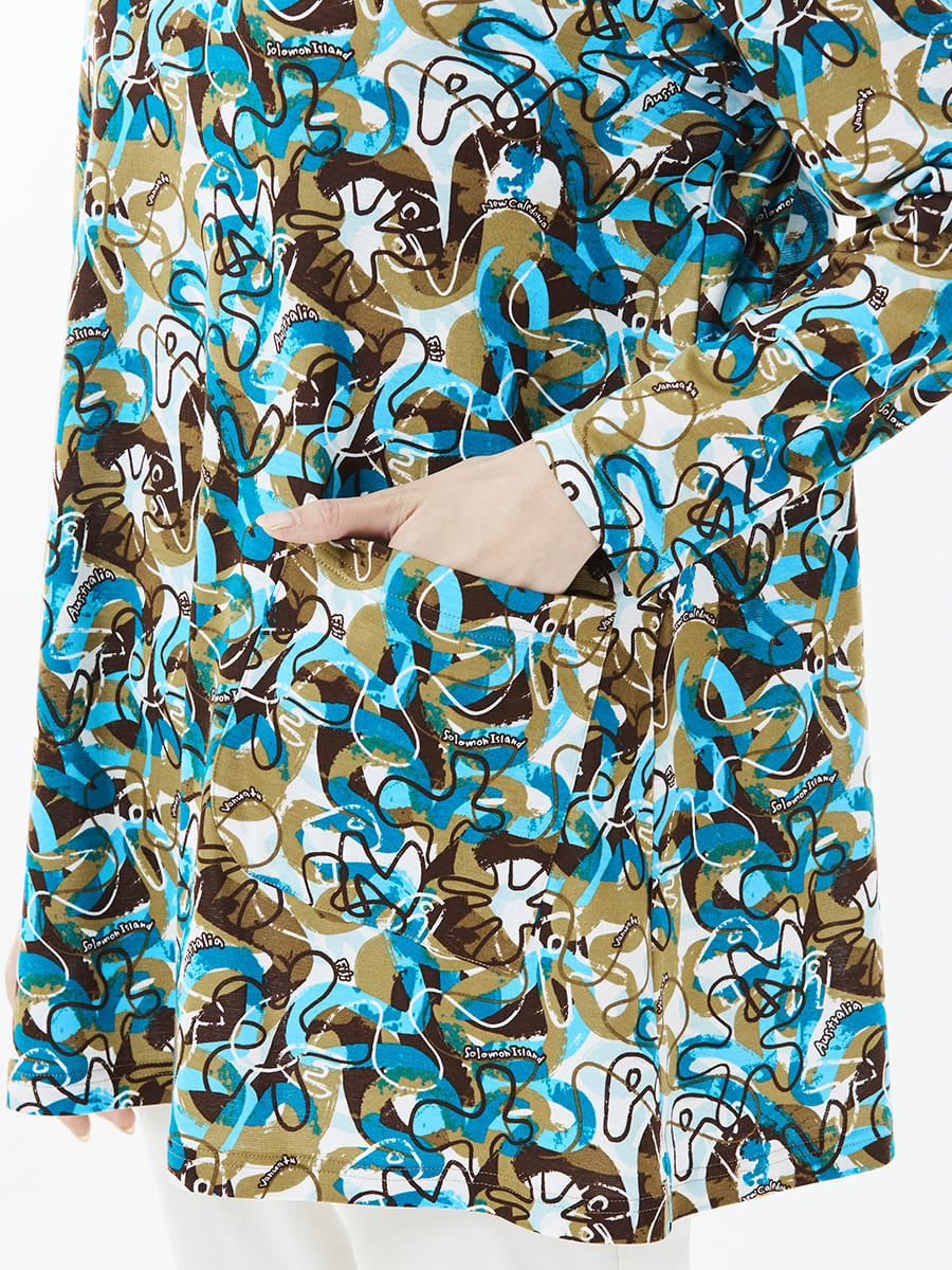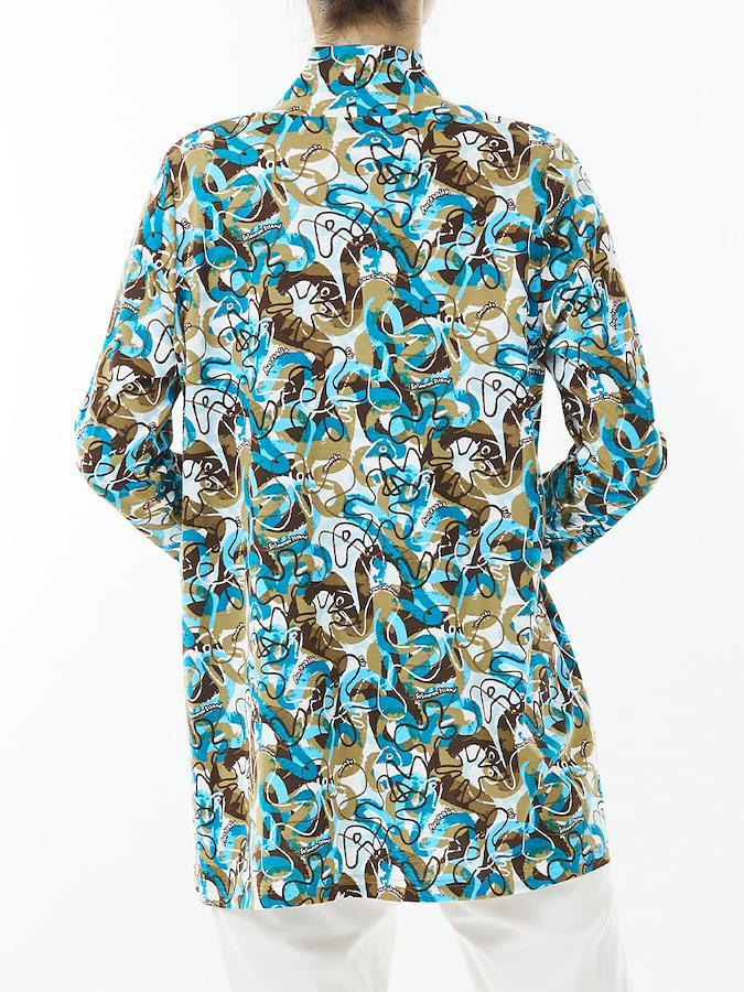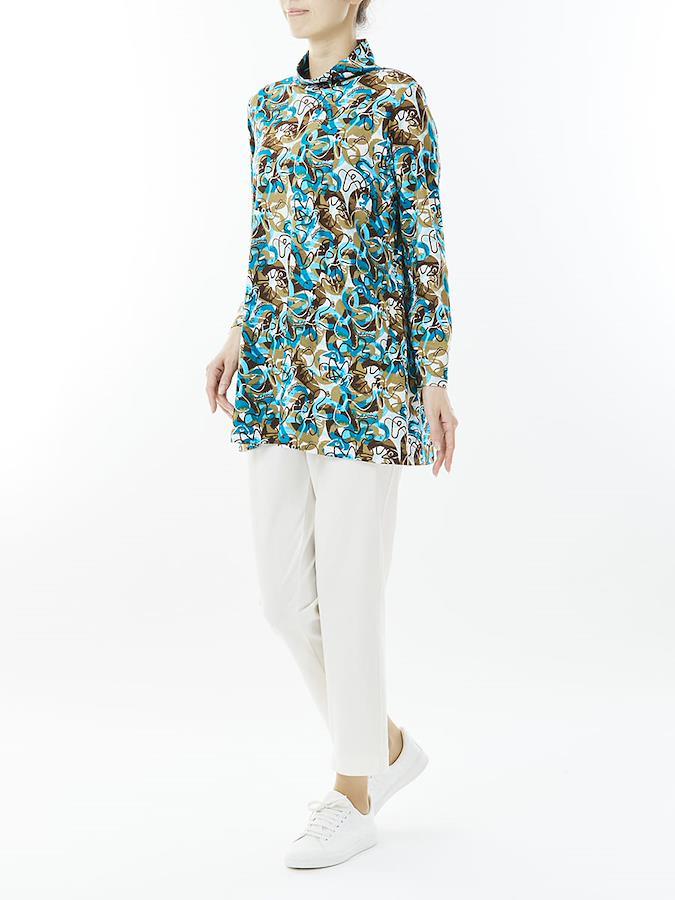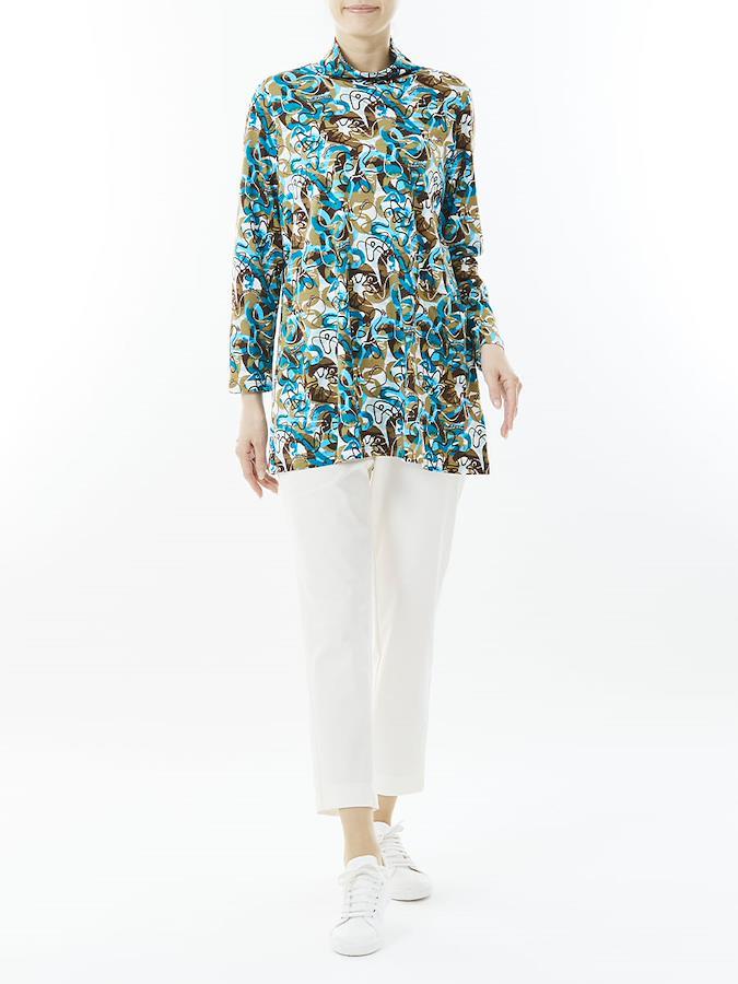光沢感と適度なハリ感、ストレッチ性のあるポンチをプリント下に使用しています。 (size-40 肩幅38cm バスト110cm 袖丈56cm 着丈72cm) サイズは多少の個体差が生じる可能性があります