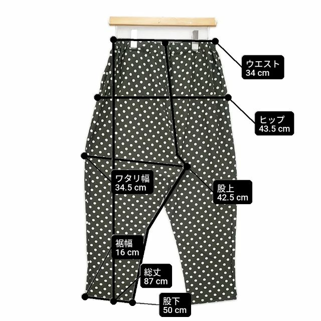| 実寸サイズ | 総丈:約87cm ウエスト:約34cm ウエスト最長:約47cm 股上:約42.5cm 股下:約50cm ヒップ:約43.5cm ワタリ幅:約34.5cm 裾幅:約16cm ※採寸画像がある商品はハンガーに吊るした状態での計測のため、平置きでの採寸とは差が生じる場合がございます。平置きでの実寸サイズをご希望の場合は、ご購入前に必ずご質問ください。 ※記載以外のサイズが合わないことを理由とした返品はできませんので、 記載部分以外で実寸サイズの気になる箇所があれば必ず購入前にご質問ください。 |