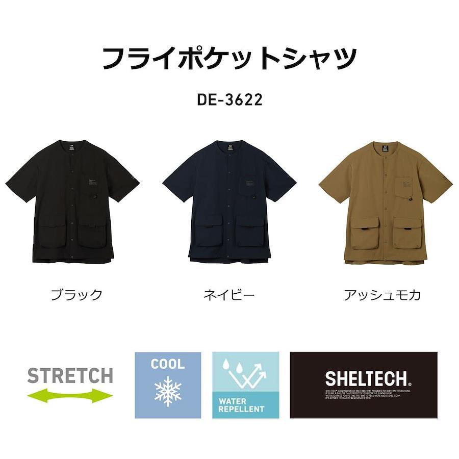 ポケットを浮かせることで、腰巻き自動膨張を付けても大容量ポケットが使用できるフライポケットを採用。自動膨張が膨らんだ際にはポケット下のベルクロが外れます。胸ポケットには新ピンオンリールホルダーを採用。素材は撥水・接触冷感・遮熱性を兼ね備えたSHELTECを採用。肌面は凹凸があり、べたつきにくく、ドライな着用感。