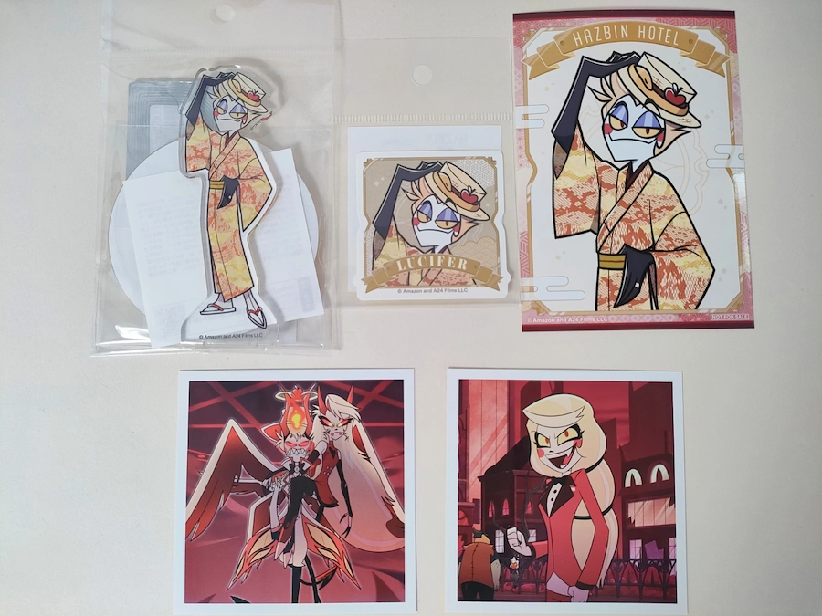 Set includes:• Lucifer Acrylic Stand (Kimono Ver.)• Lucifer Sticker• Lucifer Bromide• Charlie Mashikore Card• Lucifer & Charlie Mashikore Card Set