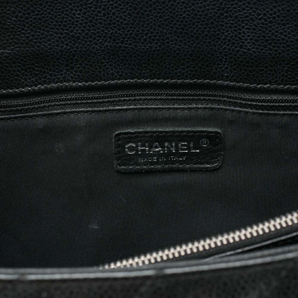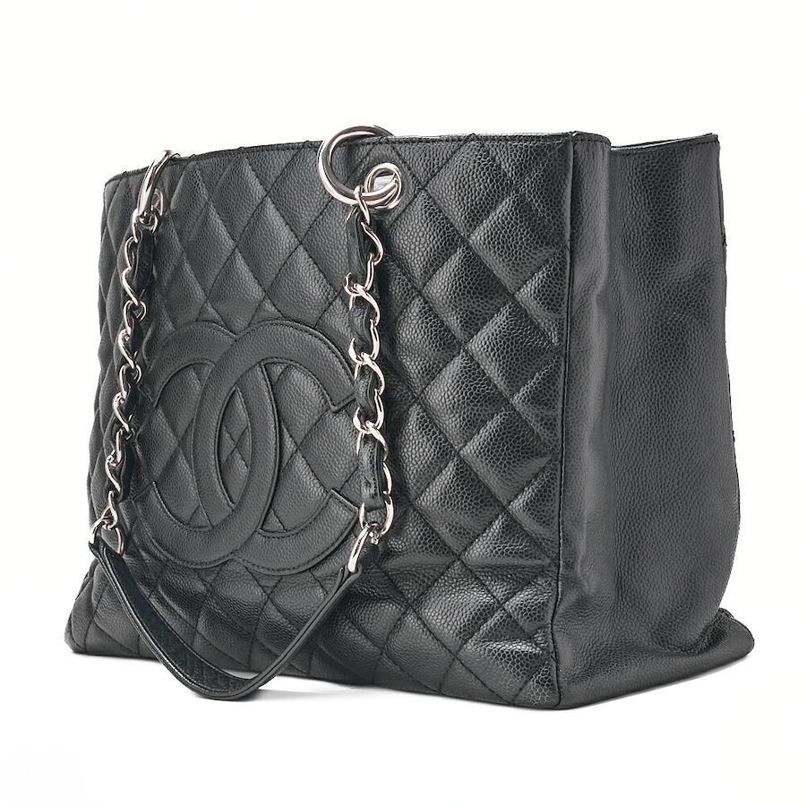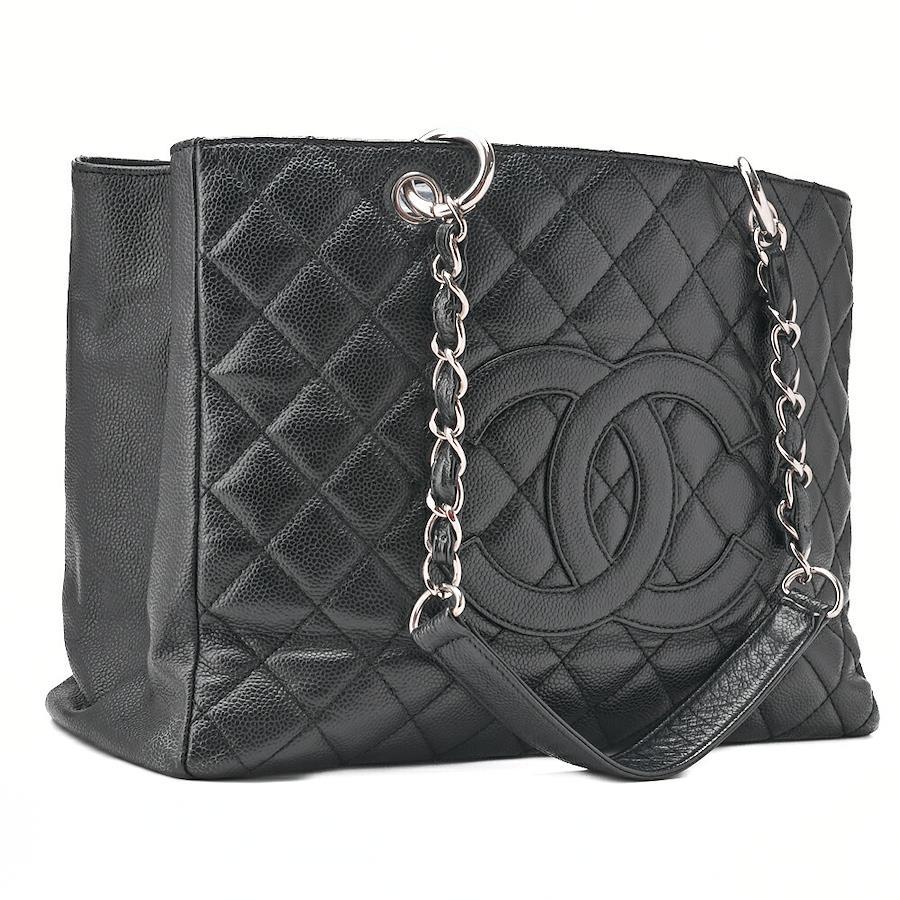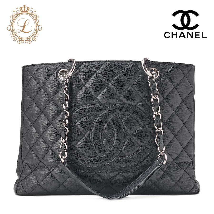 Pre-owned CHANEL Matelasse GST Chain Tote Shoulder Bag in Black Caviskin with Silver Hardware.