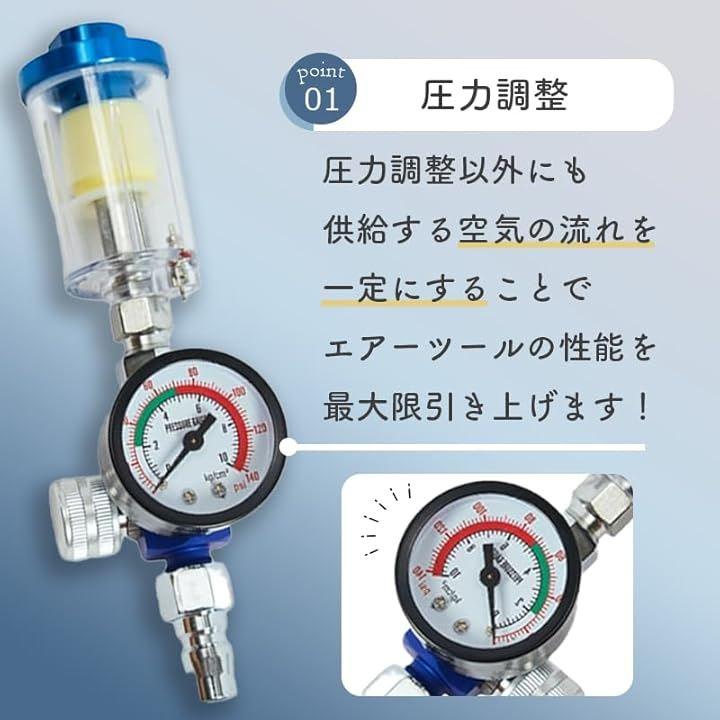 エアーフィルター本体ボディは透明な仕様になっているので内部が確認がしやすく、見やすい目盛りの付いた便利な圧力計付きでエアの圧力調整が行えます。