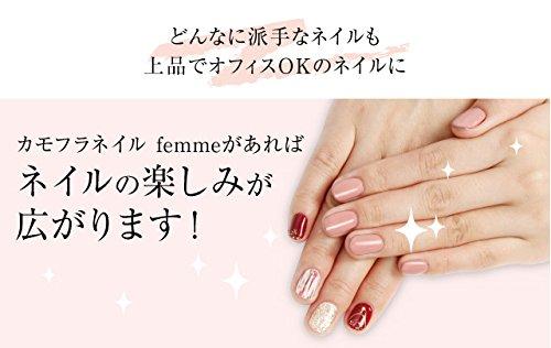 急な出張や来客時にネイルをオフしなければいけなかったり、普段からネイルを楽しみたいのに仕事で派手なネイルがNGだったり、ネイルアートを楽しみたいのになかなか楽しめない・・・という方に。「カモフラネイルfemme」を使えば、どんなときでもすぐに派手なネイルを落ち着いた上品ネイルにチェンジできます。さらに元のネイルを傷つけずにオフできるので、仕事のときはON!休日はOFF!してもっとネイルを楽しめます。