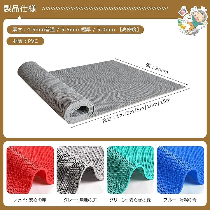 「商品詳細」 厚さ:4.5mm/5.5mm サイズ:幅0.9m x 長さ1m / 3m / 5m / 10m / 15m(自由に選択可能) 材質:環境に優しいPVC(ポリ塩化ビニル)、安全無毒 特長:高耐久・耐磨耗・耐水性・難燃性・防音性 変形しにくく、繰り返し使用可能な滑り止めマット