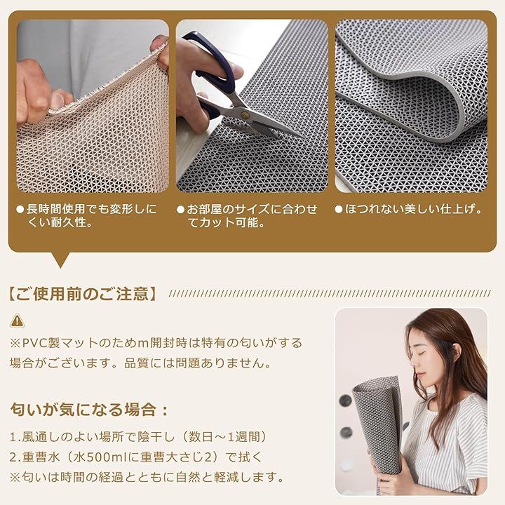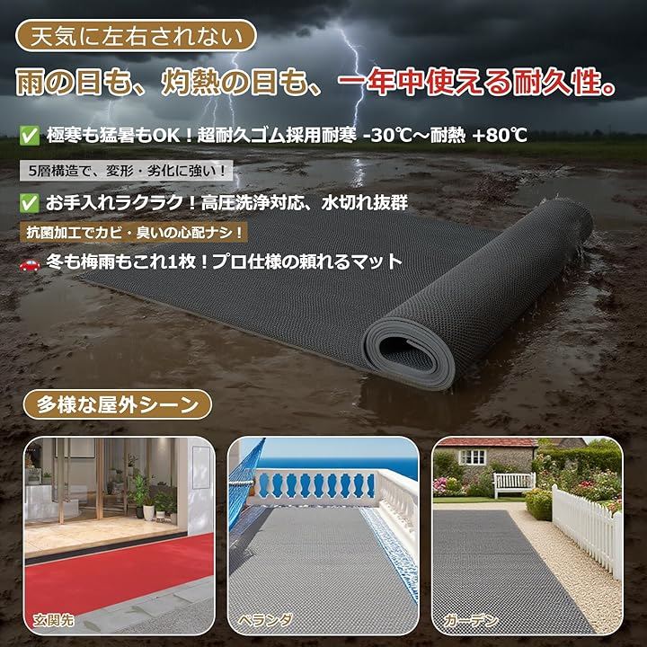 「多機能滑り止めシート|屋内・屋外兼用」 ️ 夏:雨水がサッと流れる排水性 ️ 冬:雪や氷の上でもしっかり滑り止め ペットフレンドリー:コンクリートや石の庭に敷けば、犬の足への負担軽減 玄関用:泥や砂利を効果的にブロック