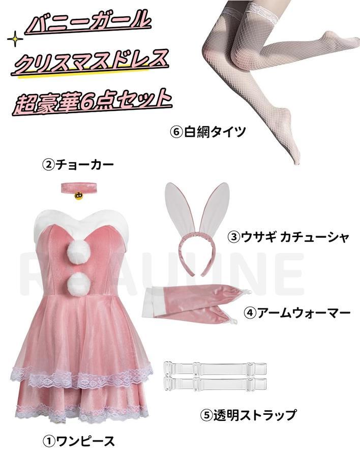 【6点セット内容】 ①ワンピース②チョーカー③ウサギ カチューシャ④アームウォーマー⑤透明ストラップ ⑥白網タイツ。新作サンタのワンピースが登場!サンタコスに必要なものが全てセットになっています。【素材】 高品質なベロア生地を使用しており、高級感があります。縫製、細部にまでこだわって作られた質の高いサンタ衣装です。生地は柔らかく肌に優しく、着心地がよいです。やや薄くて、部屋の中の着用に適します。【豊富なサイズ】小さいサイズから大きいサイズまで豊富なサイズ展開!スリムな方からぽっちゃりさんまで対応したサイズ展開です。どなたでも綺麗に着こなせます。【デザイン】?ウサギ耳カチューシャを設計して、内側には柔らかい鋼を使って、ご自由に曲げることができ、いろんな形に変えることができます。すぐ簡単にかわいいバニーガールサンタに変身できます。?ベルベットのネックリングの長さは調整可能です。素敵な鐘を付属します。?胸部分はふわふわなデザインしており、前に白いふわふわボールを飾って、後ろに弾力性があるバンドを使います。そして透明なショルダーベルトが調整でき、頑丈で、着用したままでダンスしても露出する心配がありません。【デザイン】?ダブルスカート、レーストリムのデザインです。裏側にはベルベットを使って、外側にメッシュで、パールのようなピカピカな光沢感があり、活気で青春感を溢れて、パーティーの場合に絶対注目されるでしょう。?背中部分に素敵な大き目な白い蝶々リボンを組み合わせます。?超豪華なバニーガールのクリスマスドレス6点セットはとてもお買い得で、更に白い網タイツが付属しております。ご注意:着用前に表裏をご確認ください。【イベントで大活躍】クリスマス、ハロウィンにはもちろん、仮装パーティ、忘年会、 新年会、 学園祭 、文化祭、演出ショー、撮影 、発表会、各種イベントなどにも使えます!可愛いセクシーなサンタコスで、パーティーやイベントで主役間違いなしですよ♪ショップ、飲食店、企業や遊戯施設、テーマパークなど年末やクリスマスイベントで大活躍のサンタコスチュームです。 【製品詳細のアップグレード説明】旧版の袖口と指の繋ぐ布は白い生地でしたが、新版では同色の生地となっています。頸部の装飾ベルトにもアップグレード処理を採用しました。もともとのマジックテープ調節から金属留め金調節に変更された。調節範囲が大きくなりました。新旧タイプの商品がランダム