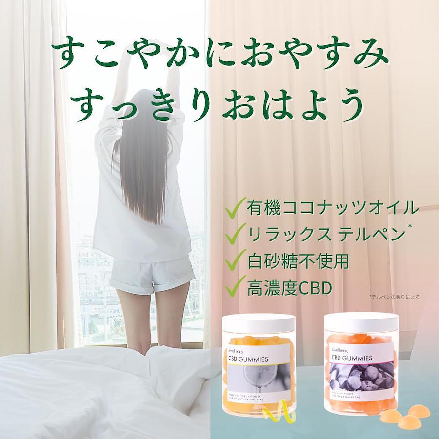 ・原材料名/水飴(国内製造)、てんさい糖、ゼラチン、もも濃縮果汁、有機ココナッツオイル、GABA、カンナビジオール、粉末オブラート、澱粉/ソルビトール、酸味料(クエン酸)、香料、乳化剤、野菜色素、光沢剤、(一部に大豆を含む)
