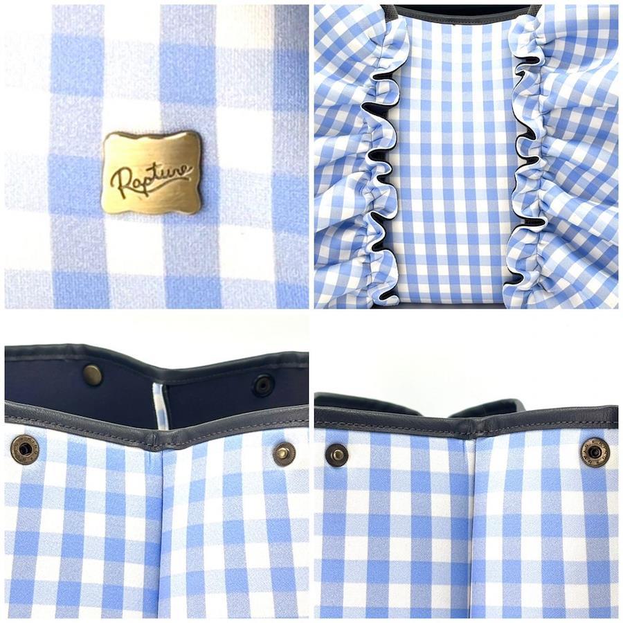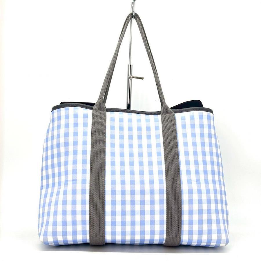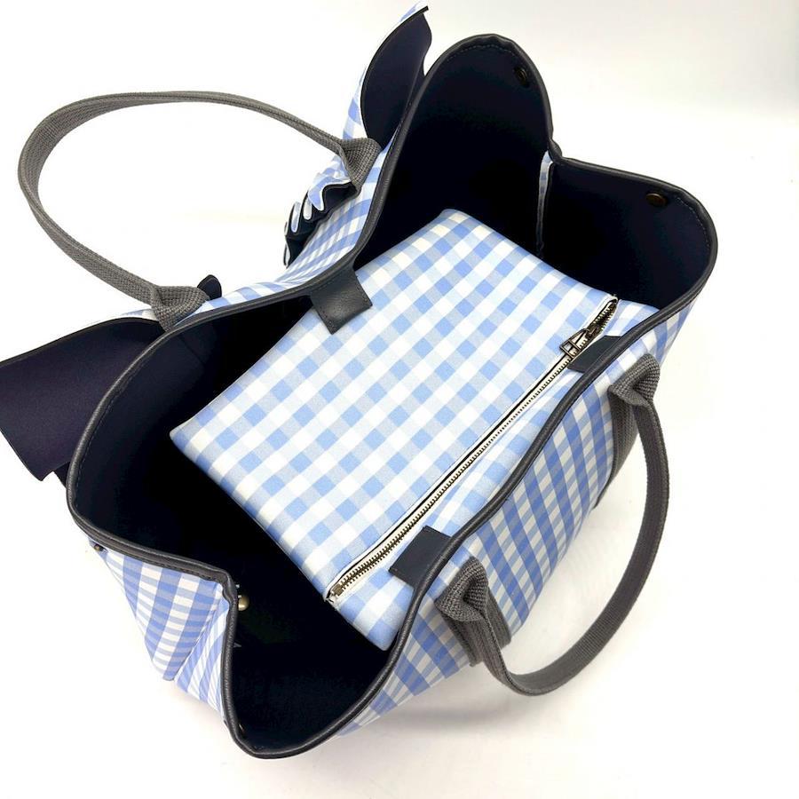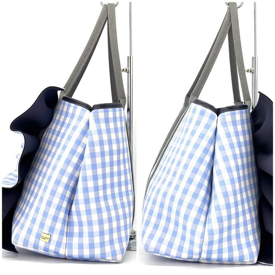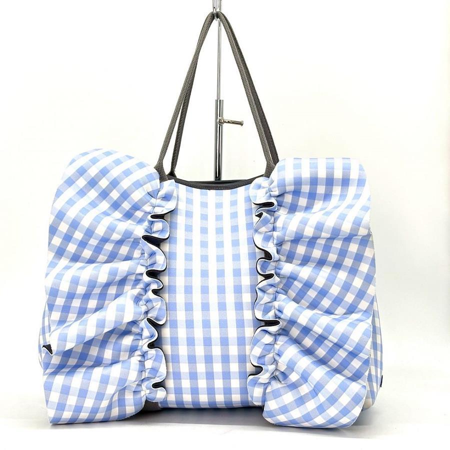 【商品説明】・きれいめにもカジュアルにも振れる、視線を惹くギンガムチェックのトートバッグ。フリルの立体感が装いに表情を添え、A4収納可能で通勤やお出かけにも活躍します。取り外し可能なポーチ付きで、いま季節感のあるブルートーンや春夏の軽やかなムードとも相性の良い一点です。