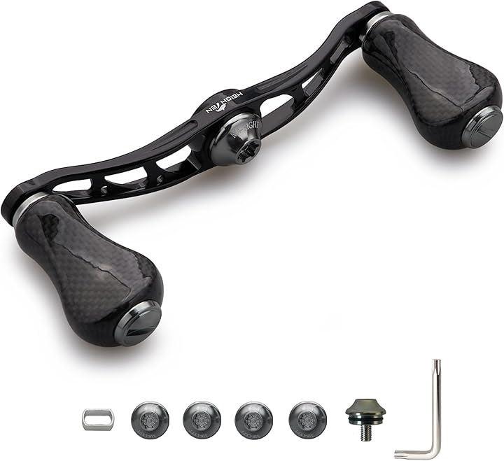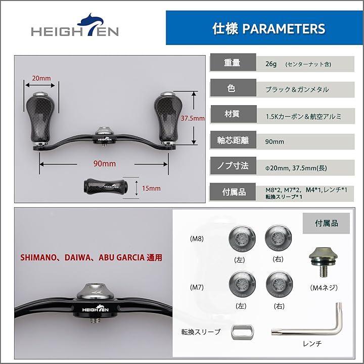 「サイズ」ハンドル軸心距離90mm、ノブ直径20mm/21mm 「総重」26g/27g「素材」70航空アルミ、1.5Kカーボン。