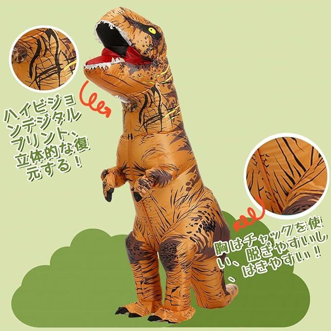 ■商品名[REKUCCI] 恐竜 着ぐるみ コスプレ ハロウィン ティラノサウルス コスチューム 大人も子供も楽しめるティラノサウルスのコスプレ 膨張式 クリスマス 誕生日 文化祭 イベント (子供120CM-140CM%カンマ% ブラウン)