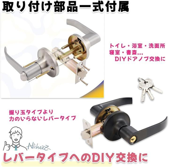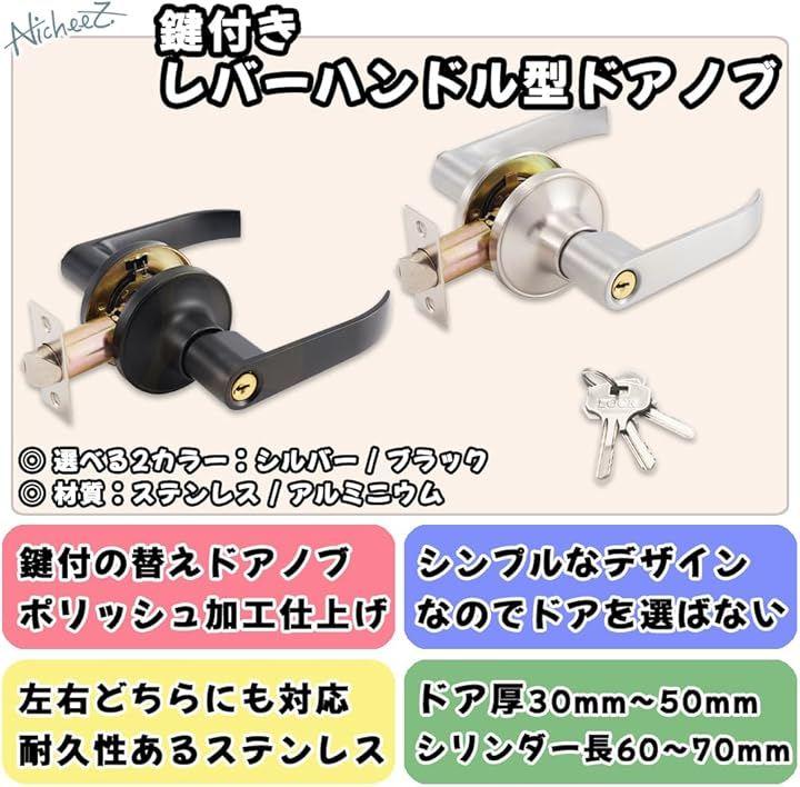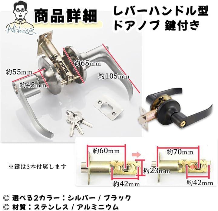 「商品内容」 交換用鍵付きレバーハンドル型ドアノブ 材質:ステンレス/アルミニウム カラー:シルバー/ブラック サイズ:レバー長さ/約105mm 飾り座直径/約65cm 取付穴間隔/45mm *鍵は3本付属します