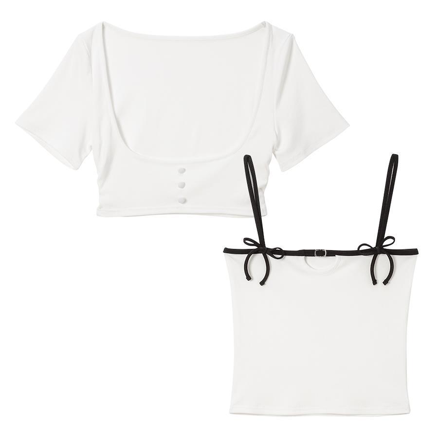 キャミソールとボレロのセットアイテム【デザイン】広めに開けた首元とリボンデザインに惹かれる、ほどよく色っぽいデザイン。パイピングデザインが自然なバストメイクを叶えてくれます。伸縮性に優れた柔らかい素材で着心地も抜群!定番のモノトーンカラーとこれからの季節にぴったりなミントの3色展開です。【素材】伸縮性のあるカットソー素材です。《透け感》カラーによってあり 《生地の厚さ》普通 《裏地》なし 《伸縮性》あり《生産国》中国