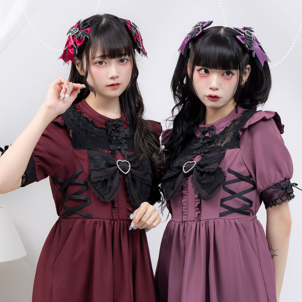 レースフリルとリボンたっぷりの地雷系レースアップワンピース