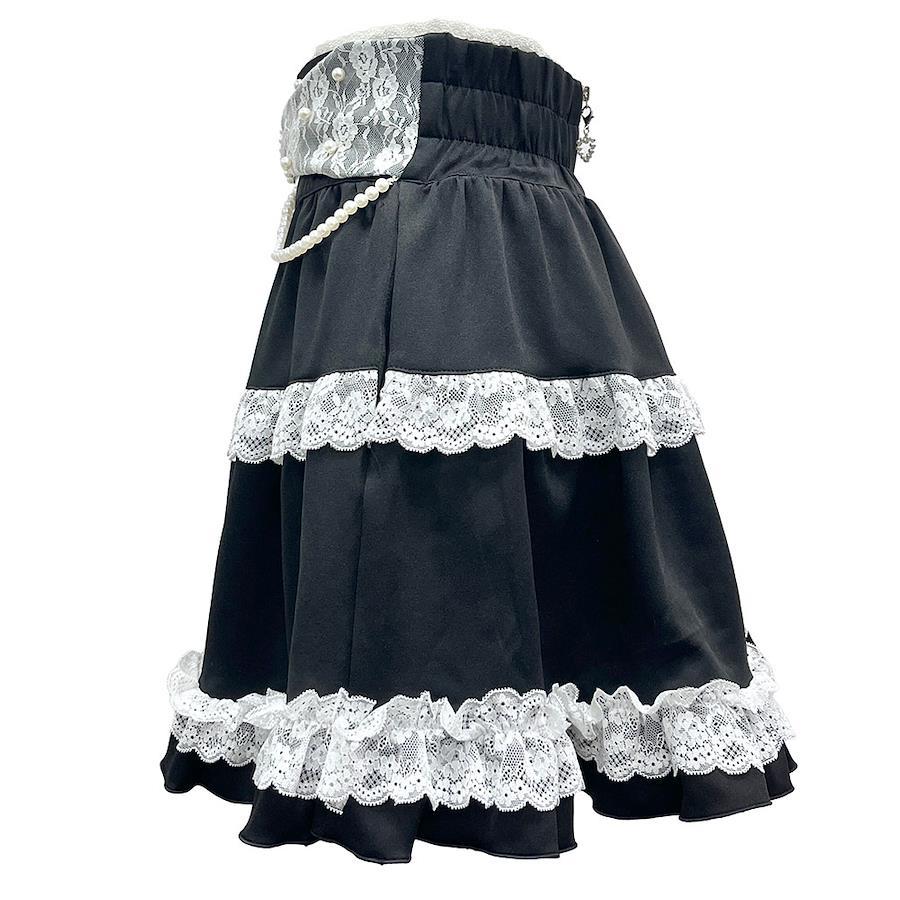 リボンパールチェーンレースフリルスカート♪【デザイン】ウエスト部分の大きいレースパールリボンがポイントになりますバックルもかわいいハートパールバックルになっていますパールチェーンがかわいさ激増ティアードスカート風になっていて、レースフリルがたっぷりなのもかわいい後ろファスナーにもハートパールチャームが付いています。【素材】しっかりとした素材になっています。本体に裏地付き、後ファスナー、ウエストゴム付きです。【コーディネート】甘めブラウスに合わせるのがオススメ量産型のコーデにピッタリのアイテムです。《透け感》なし 《生地の厚さ》普通 《裏地》あり《生産国》中国