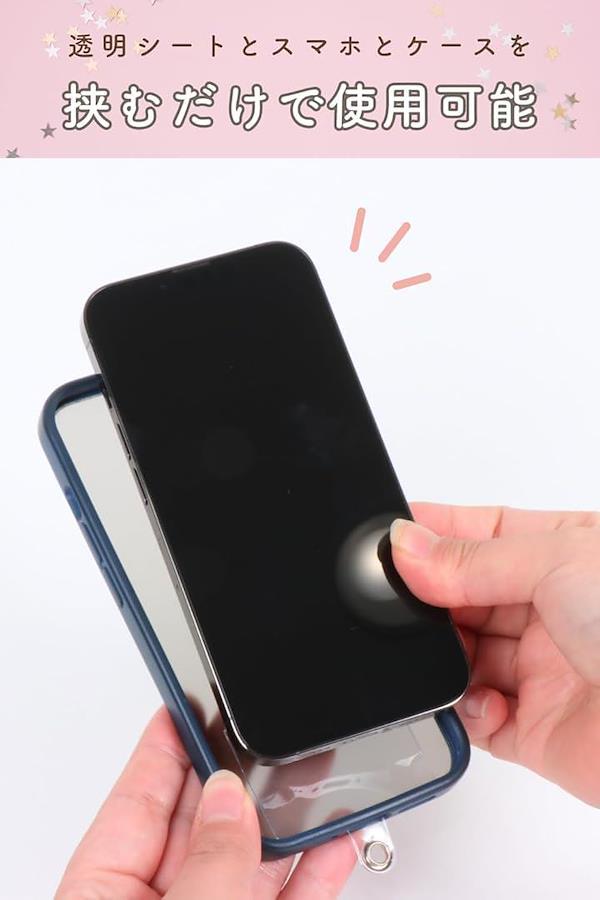 スマホショルダーストラップに付属している透明シートをスマホケースに挟んでご使用ください。