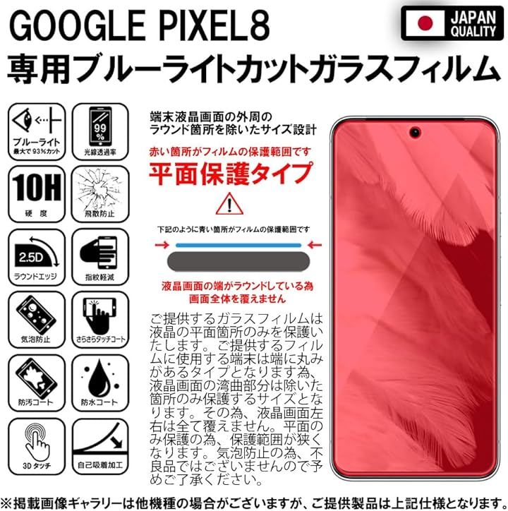 「対応機種及び仕様」Google Pixel 8 グーグルピクセル8 ブルーライトカットガラスフィルム2枚セット。