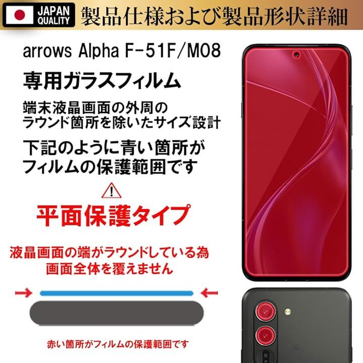 対応機種及び仕様arrows Alpha F-51F / M08 ブルーライトカットガラスフィルム2枚+クリアカメラレンズ保護ガラスフィルム2枚セット。