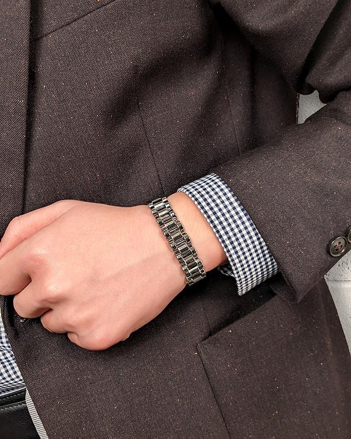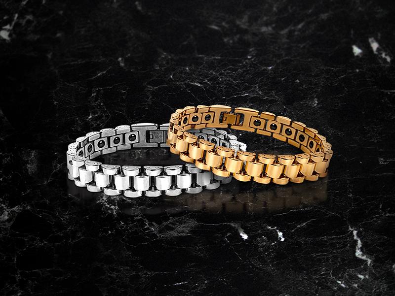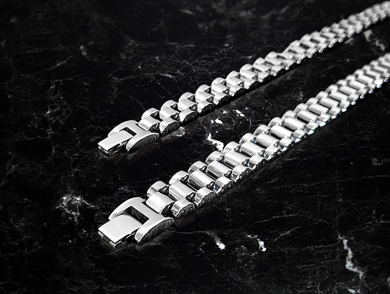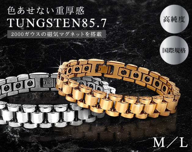 ★圧倒的な存在感と重厚感を兼ね備えたレアメタル、超硬タングステンブレスレット!*有名ブランド「ロレックス」を彷彿とさせ、まさに着こなしの格を上げる男のブレスレットです。*留め具には「TUNGSTEN85.7」と刻印されており、これは高純度&国際規格の証です。◇レアメタル「タングステン」とは金とほぼ同比重でダイヤモンドに匹敵するほどの強度を誇り金属の中でもっとも融点が高く宇宙ロケットの部材にも使用されています。その強度は50年手入れしなくても輝き続けるといわれており、色あせない重厚感をお楽しみ頂けます。人体への影響が少ないことからCT装置に使用されるなど医療分野でも活躍している素材で金属アレルギーを起こしにくく、滅多なことでは傷つかない希少金属としても有名です。*内側に2000ガウスの磁気マグネットを搭載しており、健康志向の方にも重宝されます。*ベロア調の専用箱に入れてのお届けでプレゼントにも最適です。