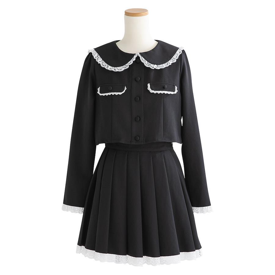 襟や袖口、胸ポケット、スカ―ト裾等レースをふんだんに使用しており、写真映え間違いなしのデザインに♪