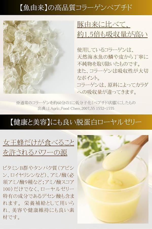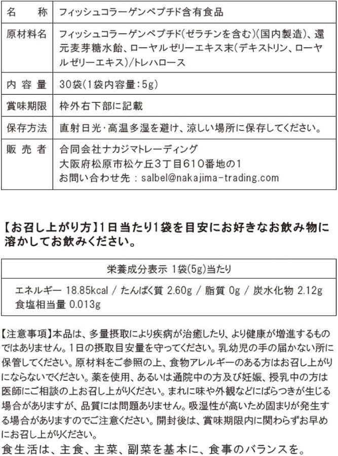 原材料:フィッシュコラーゲンペプチド(ゼラチンを含む)(国内製造)、還元麦芽糖水飴、ローヤルゼリーエキス末(デキストリン、ローヤルゼリーエキス)/トレハロース