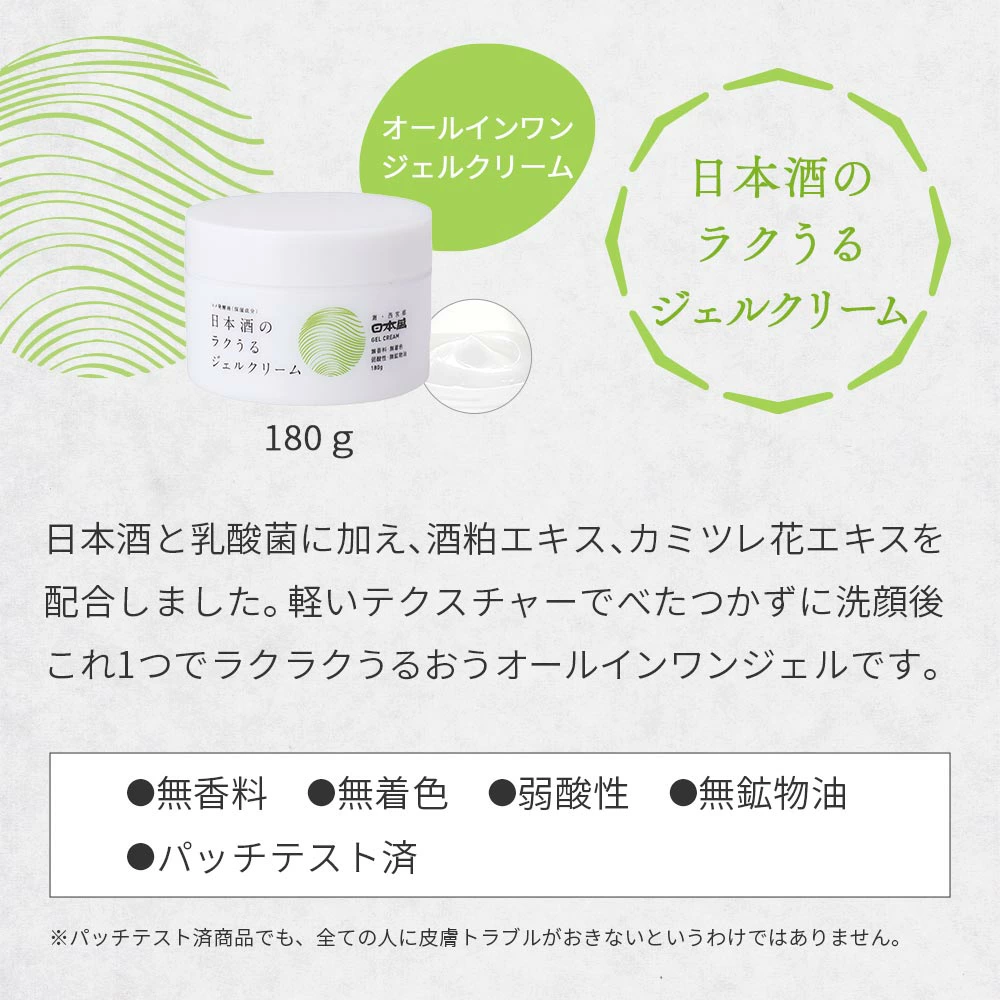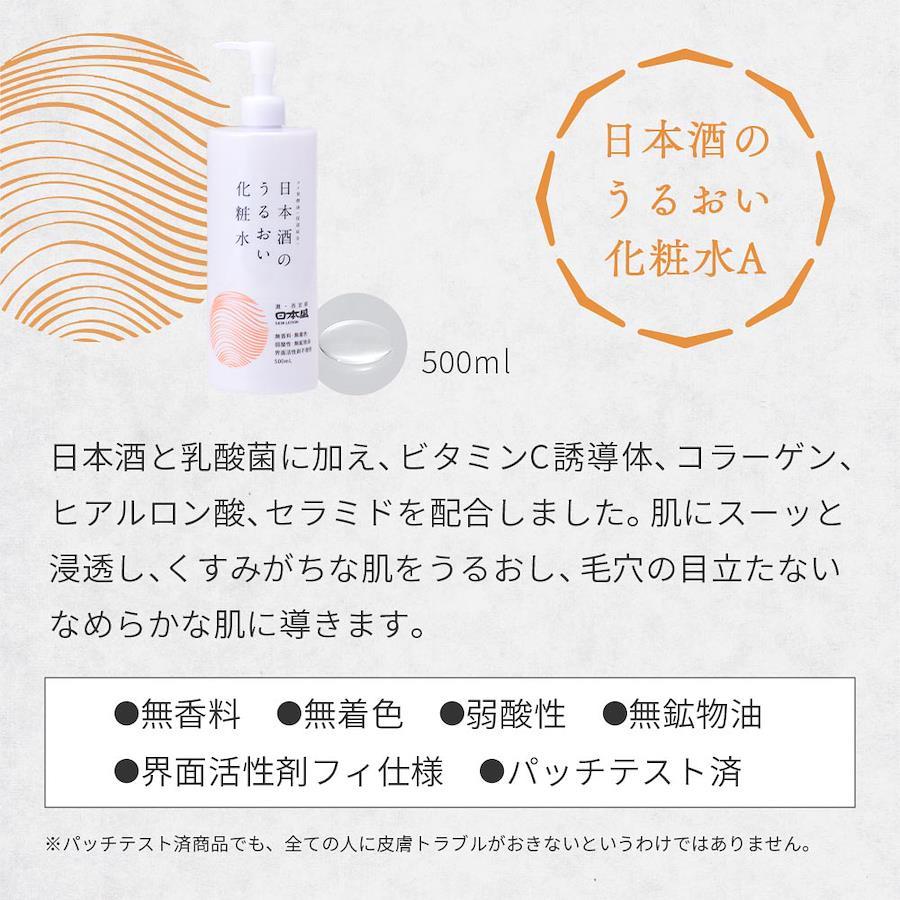 【商品名(JAN)】日本酒のうるおい化粧水A 500ml(4904070074298)日本酒の超しっとり化粧水A 500ml(4904070074328)日本酒の超しっとり化粧水A 1,000ml(4904070074304)日本酒のラクうるジェルクリーム180g(4904070062684)薬用 日本酒の美容液 ブライト リンクル50ml(4904070077008)【商品サイズ(約)】日本酒のうるおい化粧水A 500ml:高さ209×幅67×奥行67mm日本酒の超しっとり化粧水A 500ml:高さ209×幅67×奥行67mm日本酒の超しっとり化粧水A 1,000ml:高さ228×幅90×奥行90mm日本酒のラクうるジェルクリーム180g:高さ55×幅83×奥行83mm薬用 日本酒の美容液 ブライト リンクル50ml:高さ129×幅34×奥行34mm【容量】日本酒のうるおい化粧水A 500ml:500ml日本酒の超しっとり化粧水A 500ml:500ml日本酒の超しっとり化粧水A 1,000ml:1000ml日本酒のラクうるジェルクリーム180g:180g薬用 日本酒の美容液 ブライト リンクル50ml:50ml【製造国】日本【商品情報】日本酒×乳酸菌で育むうるっとつる肌酒蔵生まれの自然派コスメWの保湿成分でうるおうつや肌へ●無香料 ●無着色 ●弱酸性 ●無鉱物油 ●界面活性剤フィ仕様 ●パッチテスト済※パッチテスト済商品でも、全ての人に皮膚トラブルがおきないというわけではありません