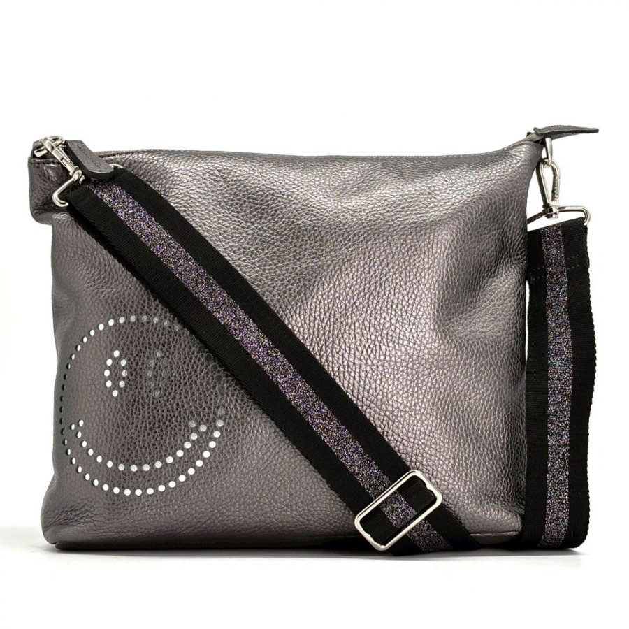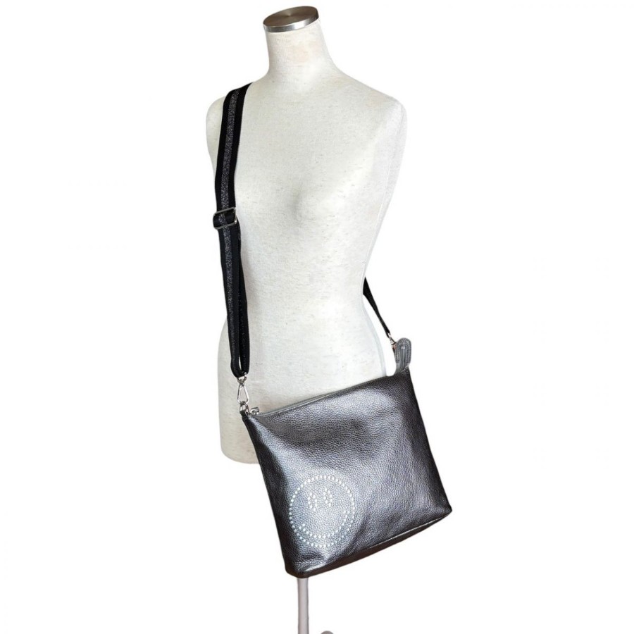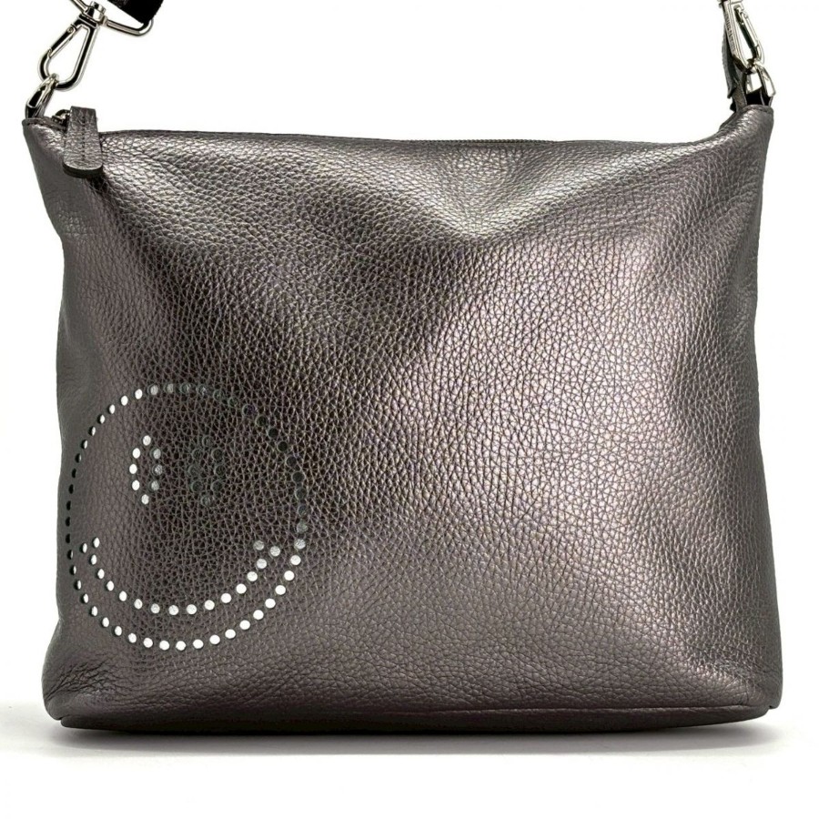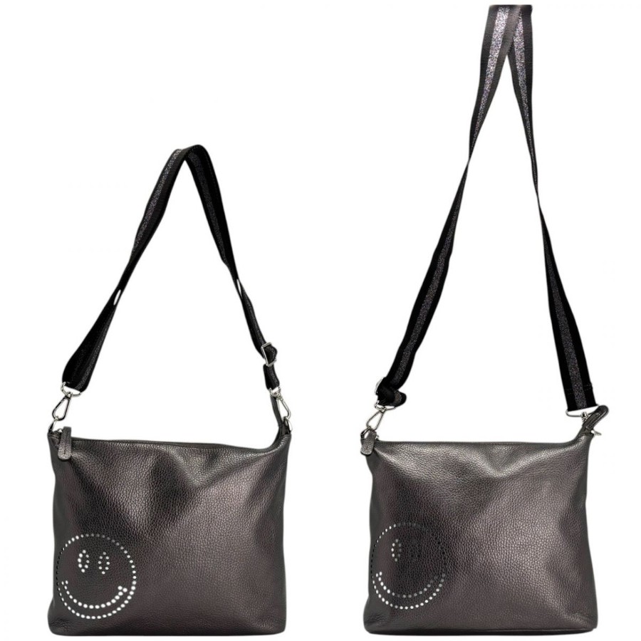 【商品説明】・ガンメタリックの奥行きある光沢に、さりげないスマイルモチーフが映える一品。軽やかなホリゾンタルフォルムで身体に沿い、デイリーからカフェ時間までスマートに馴染みます。Y2Kやミニマルスタイルとも相性が良く、装いに遊び心を添えるショルダーバッグです。