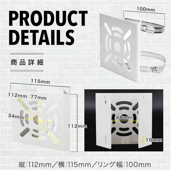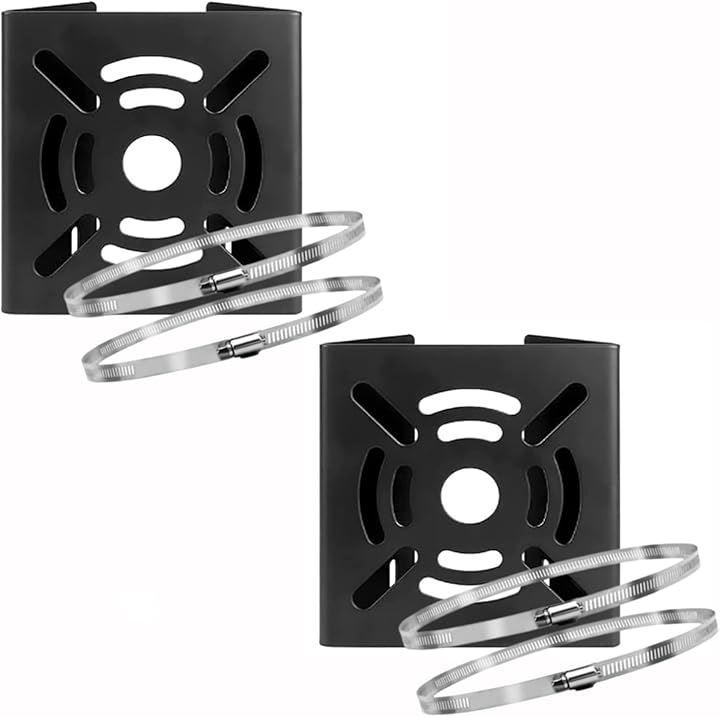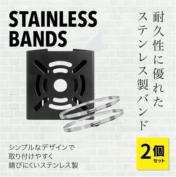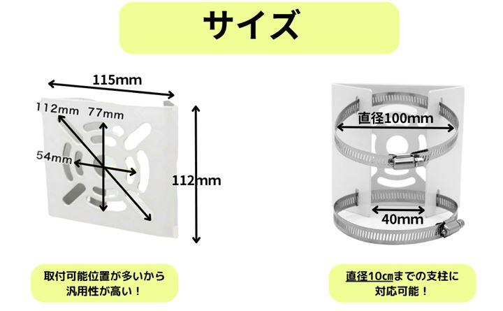 「商品内容」セット数:ブラケット本体2個、ステンレスバンド4本の計2台分 素材:金属 サイズ:カメラ設置台座部 縦/約11.2cm 横/約11.5cm ステンレスバンドの幅/約1.2cm カラー:ブラック