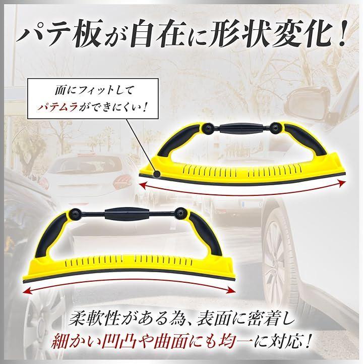 取手中心部分を回すことで自在に当て板(パテ板)部分を湾曲させることができどんな塗装箇所のヤスリ作業も可能です。