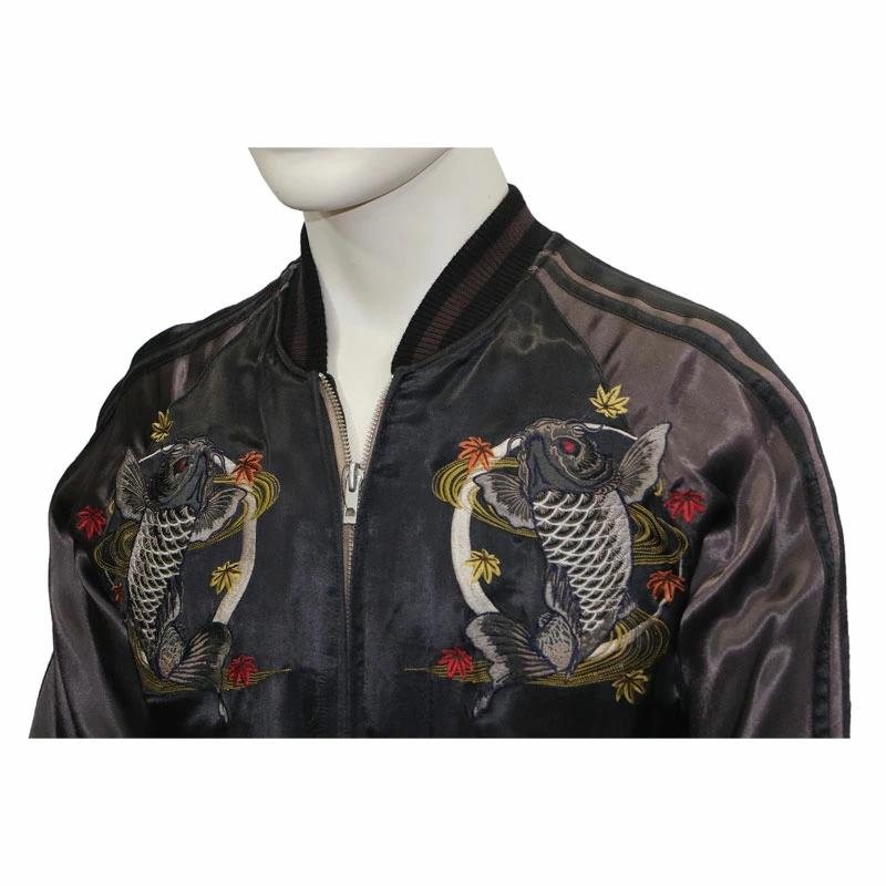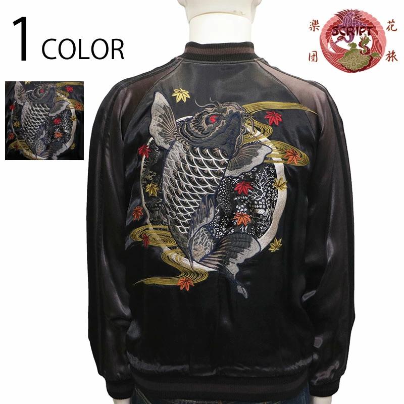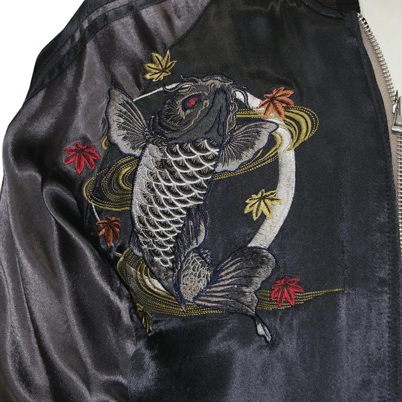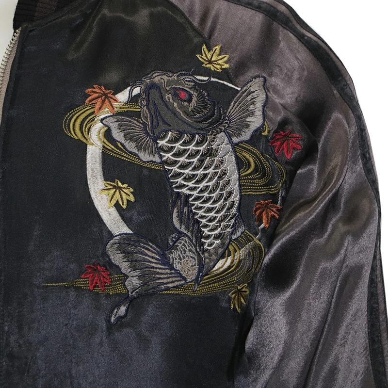 秋の夜空を背景に鯉が高く跳ね上がっているような構図が目を惹くスカジャンです。