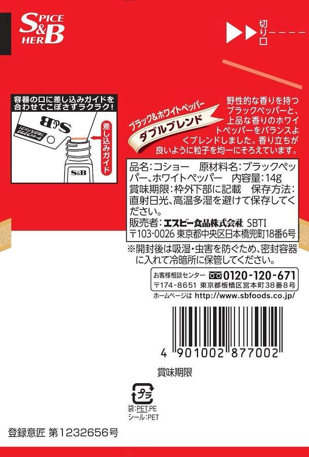 白コショー・黒コショーをご家庭で使いやすい比率にブレンドしています。他の容器に詰替えやすい形態の袋を採用しています。