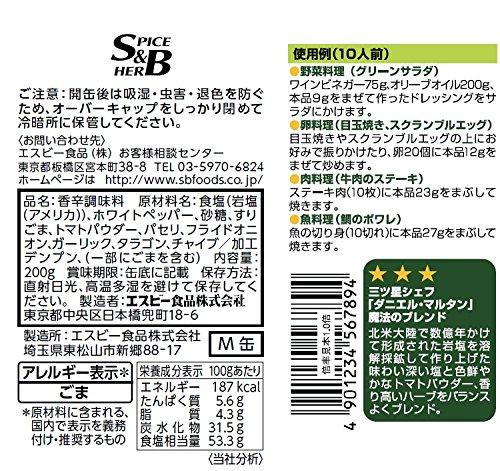 内容量:200g原材料:食塩(アメリカ)、こしょう、砂糖、ごま、トマトパウダー、パセリ、フライドオニオン、ガーリック、タラゴン、その他香辛料、加工デンプン商品サイズ(高さ×奥行×幅):110mm×87mm×87mm【重要】メーカーによる商品リニューアルに伴いパッケージ(内容量も含む)変更が行われた場合、新パッケージでお届け致します事ご了承願います。