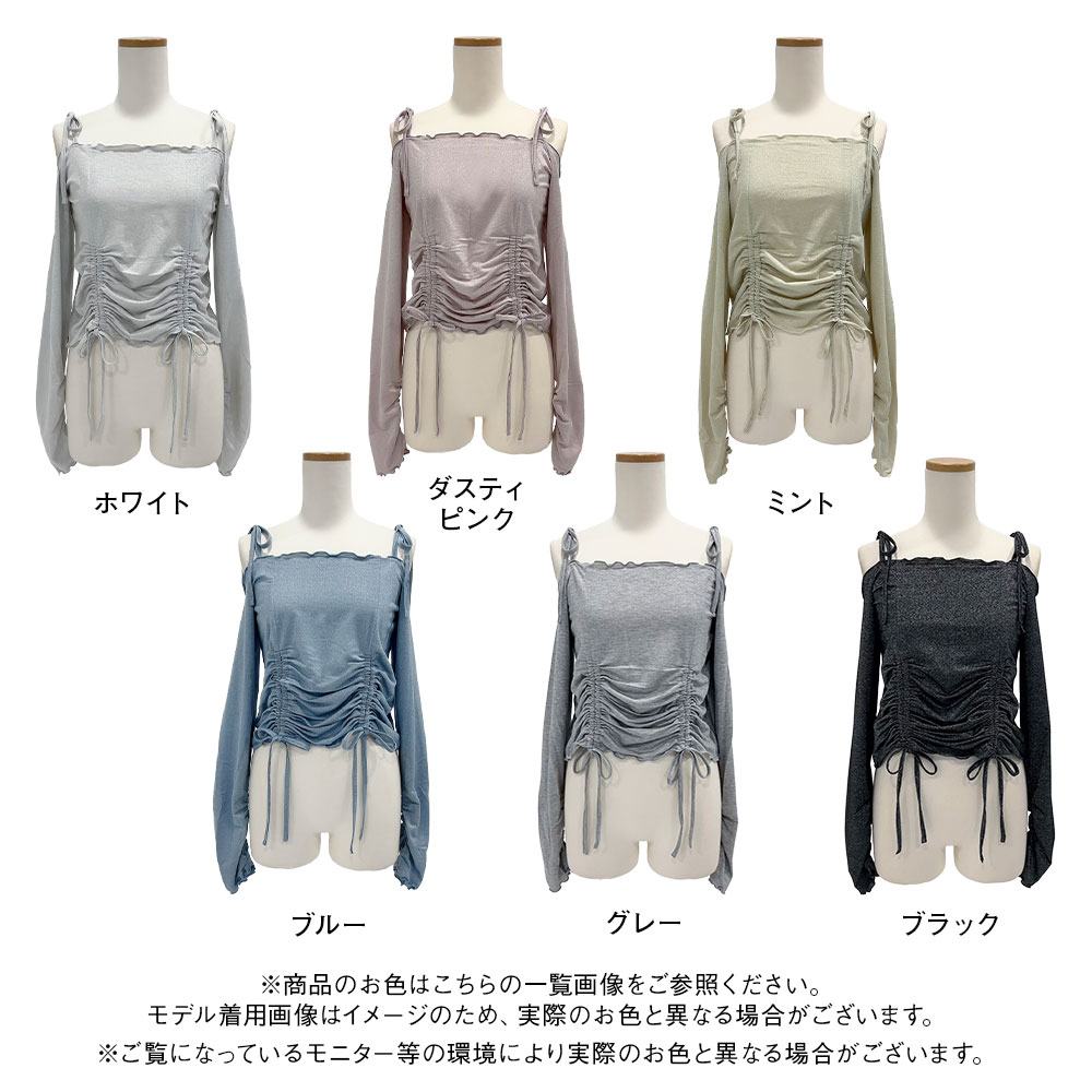 ドロストリボンや肩のリボンなど、リボンがたっぷりあしらわれた可愛いデザインのトップス。