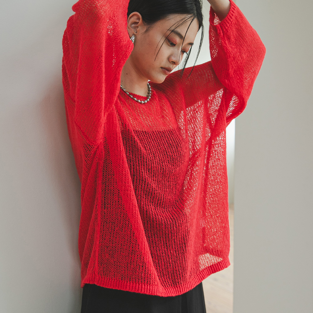モヘヤ(モヘア)混の糸を使用した、軽く柔らかい着心地でシアー感のあるニット。
