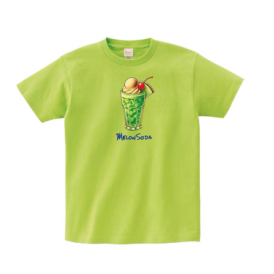 Short-sleeved Melon Soda T-shirt featuring melon soda, juice, and cream soda. Showa-era retro design perfect for restaurants, cafes, department stores, and any occasion. Original design for men, women, and kids. [5.6 oz. Heavyweight 100% Cotton, Rich Colors, Long-lasting, Natural Materials]