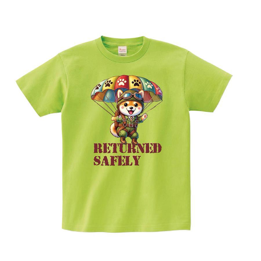 かわいらしい柴犬がパラシュートで無事に帰還したイラストをあしらったデザインTシャツです。※画像ははめ込み画像となり、実際とは多少異なりますので予めご了承ください。 ※サイズ表をよくご確認の上ご購入ください。 ※受注生産となるため、返品、交換はご遠慮ください。