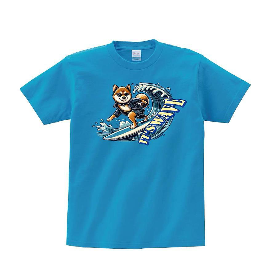 Short-sleeved Shiba Inu T-shirt featuring a surfer, surfing, and waves with sunglasses. Perfect for summer and beach outfits. Original design for men, women, and kids. [5.6 oz. Heavyweight 100% Cotton, Rich Colors, Durable, Comfortable, Natural Materials] Cotton Shirt, White, Black, Outdoor