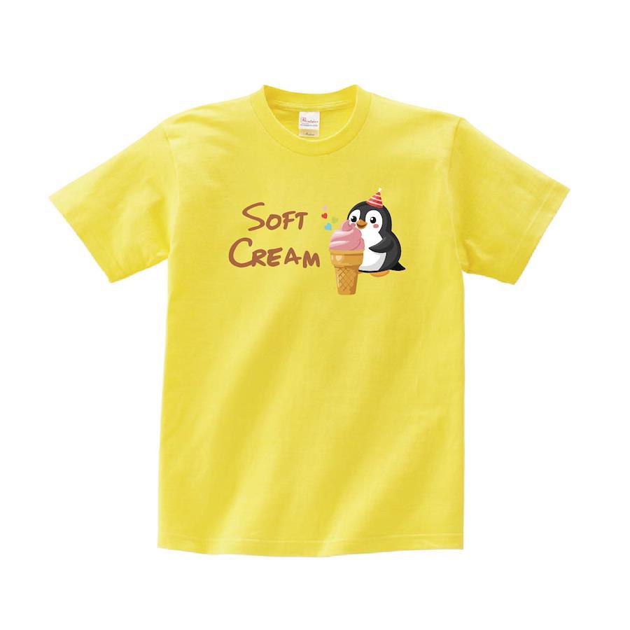 ふんわりいちご味のソフトクリームとペンギンくんのイラストデザインTシャツです。※画像ははめ込み画像となり、実際とは多少異なりますので予めご了承ください。 ※サイズ表をよくご確認の上ご購入ください。 ※受注生産となるため、返品、交換はご遠慮ください。