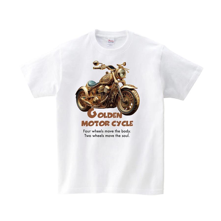 「四輪は、身体を運ぶ。二輪は魂を運ぶ。」黄金のバイクのTシャツです。豊富なサイズでのご提供です。 ※画像ははめ込み画像となり、実際とは多少異なりますので予めご了承ください。 ※サイズ表をよくご確認の上ご購入ください。 ※受注生産となるため、返品、交換はご遠慮ください。