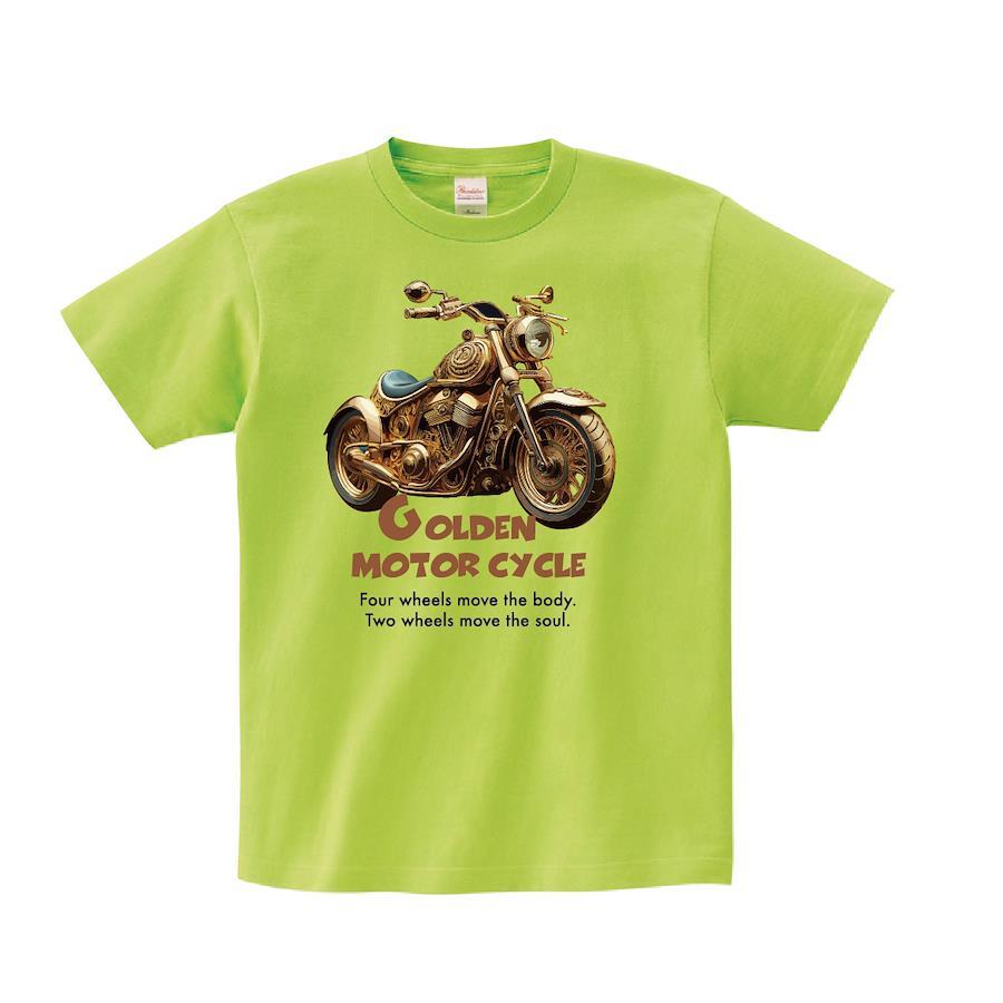 「四輪は、身体を運ぶ。二輪は魂を運ぶ。」黄金のバイクのTシャツです。豊富なサイズでのご提供です。 ※画像ははめ込み画像となり、実際とは多少異なりますので予めご了承ください。 ※サイズ表をよくご確認の上ご購入ください。 ※受注生産となるため、返品、交換はご遠慮ください。