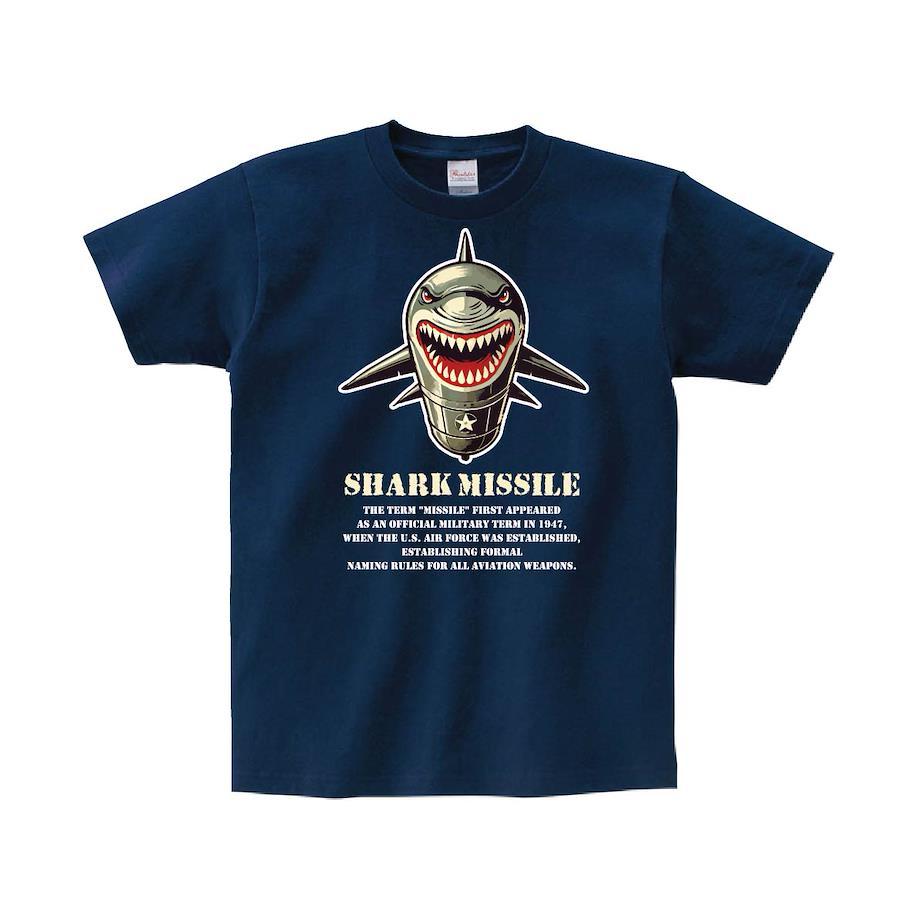 鮫のミサイルキャラクターモチーフTシャツです。※画像ははめ込み画像となり、実際とは多少異なりますので予めご了承ください。 ※サイズ表をよくご確認の上ご購入ください。 ※受注生産となるため、返品、交換はご遠慮ください。