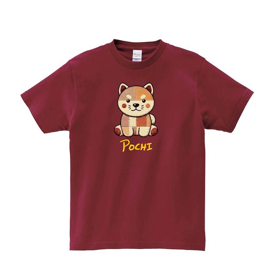 Short-sleeved T-shirt featuring a Shiba Inu (Pochi) plush toy. Patchwork and quilted, perfect for coordinating outfits. Original design for men, women, and kids. [5.6 oz. Heavyweight 100% Cotton, Rich Colors, Durable, Comfortable, Natural Materials] Cotton Shirt in White and Black. Outdoor Wear.