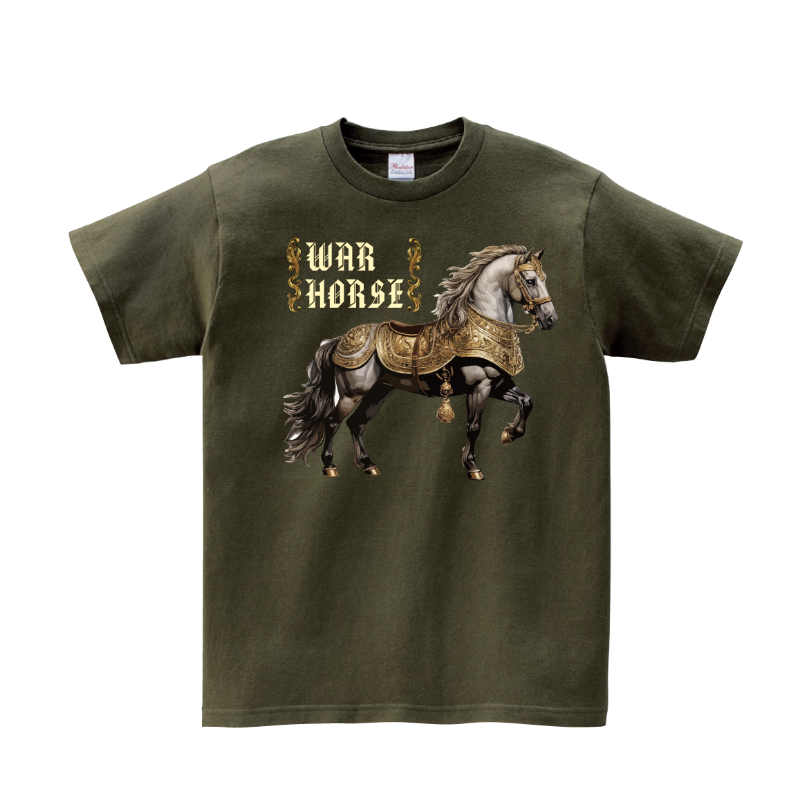 装飾の鞍を背負った軍馬のTシャツです。 ※画像ははめ込み画像となり、実際とは多少異なりますので予めご了承ください。 ※サイズ表をよくご確認の上ご購入ください。 ※受注生産となるため、返品、交換はご遠慮ください。