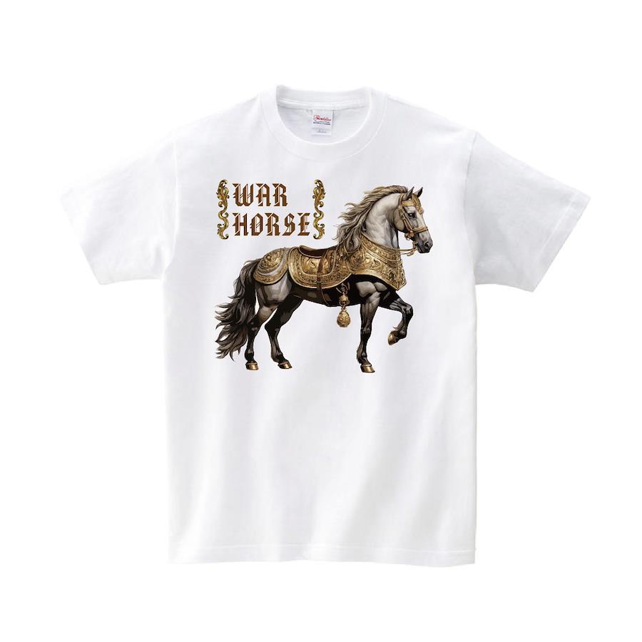 装飾の鞍を背負った軍馬のTシャツです。 ※画像ははめ込み画像となり、実際とは多少異なりますので予めご了承ください。 ※サイズ表をよくご確認の上ご購入ください。 ※受注生産となるため、返品、交換はご遠慮ください。