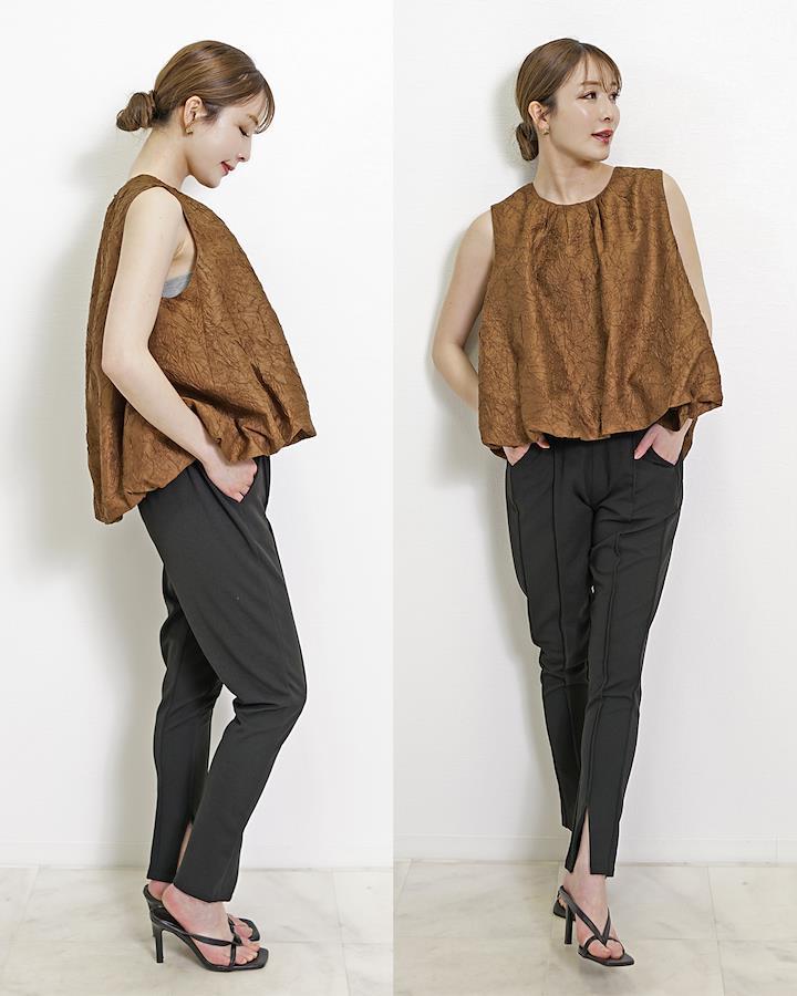 表面のシワ感が特徴的な素材で夏らしくノースリーブデザインで
