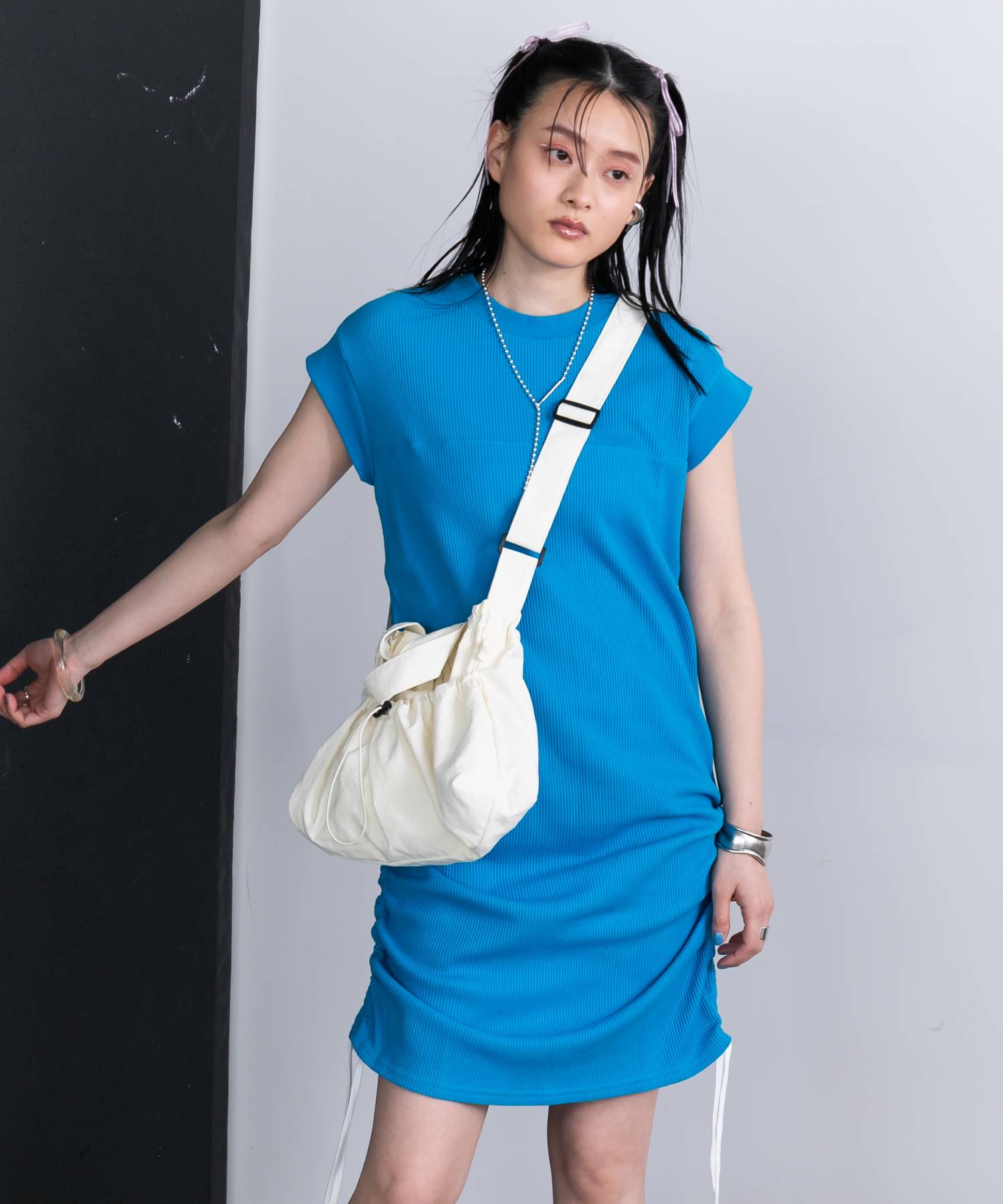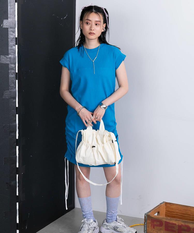 ワンピースとして1枚で着用する際には、ドロストを伸ばしてひざ丈に。